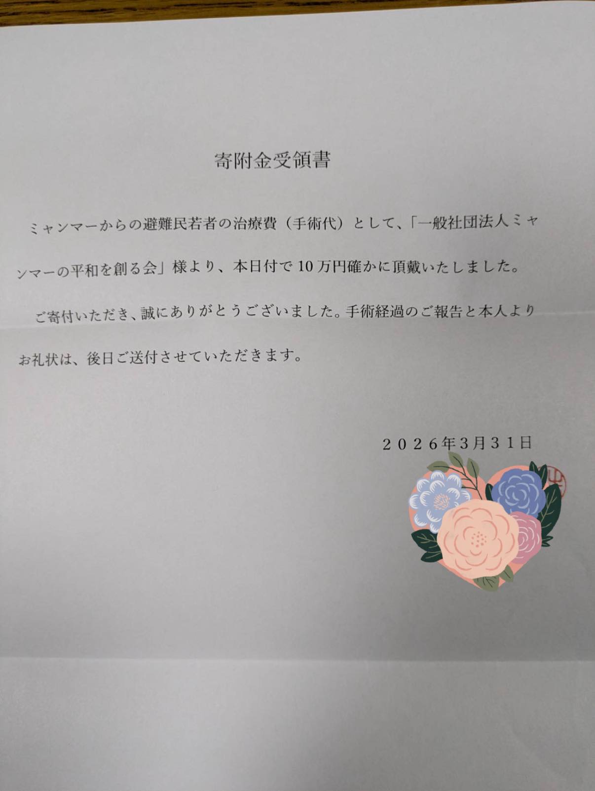 今回は、チェンマイ在住のフリーランス記者の手術費に10万円支援させていただきました。記者は取材中左脚を砲弾の破片で傷つけ、直ぐに手術をしなければ歩けなくなる状況になっていました。現地で危険に晒されながらも、懸命に取材を続けられた勇気と努力に敬意を表すとともに一日でも早い回復をお祈り申し上げます。